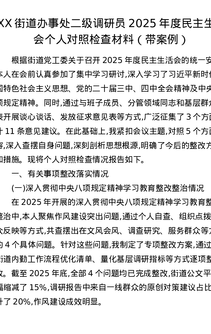 XX街道办事处二级调研员2025年度xxxxx个人对照检查材料(带案例)