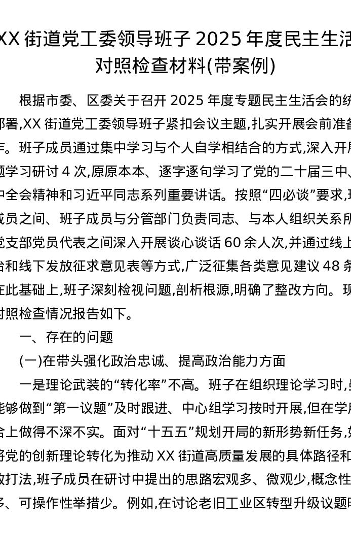 XX街道党工委领导班子2025年度xxxxx对照检查材料(带案例)