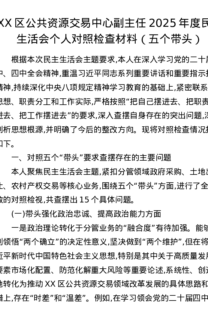 XX区公共资源交易中心副主任2025年度xxxxx个人对照检查材料(五个带头)