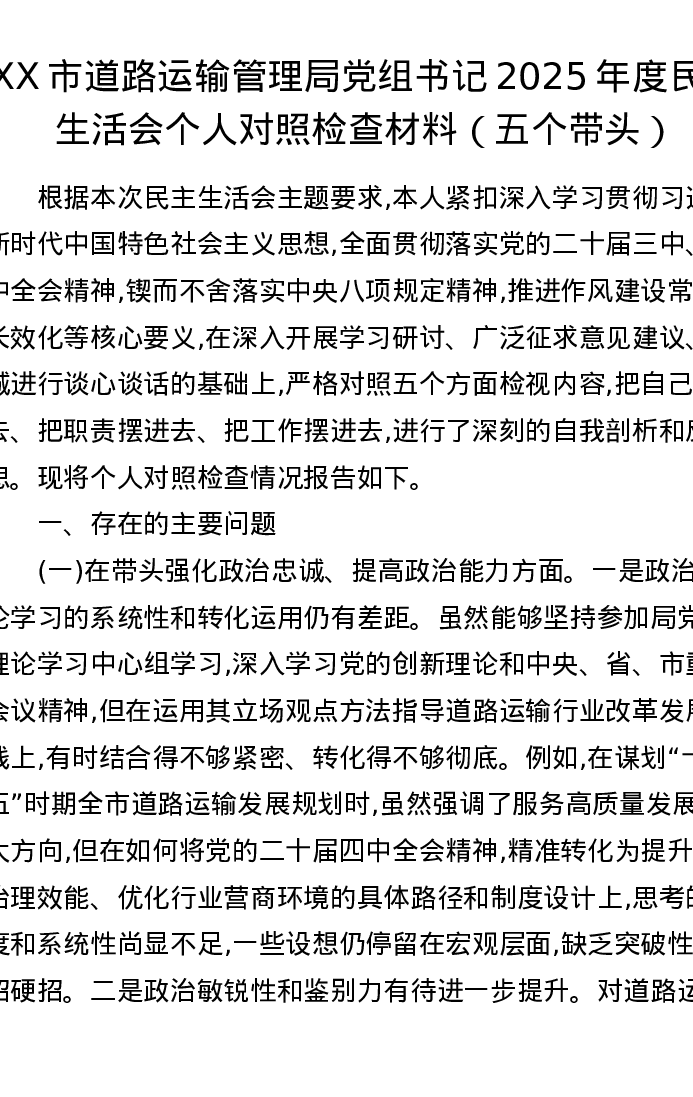 XX市道路运输管理局党组书记2025年度xxxxx个人对照检查材料(五个带头)