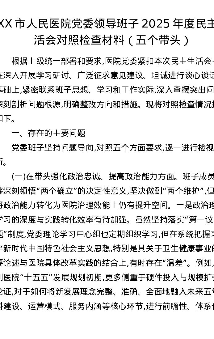 XX市人民医院党委领导班子2025年度xxxxx对照检查材料(五个带头)