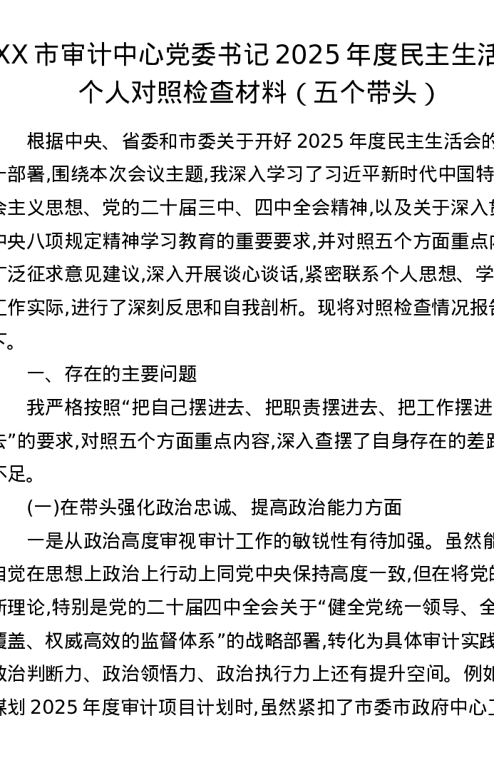 XX市审计中心党委书记2025年度xxxxx个人对照检查材料(五个带头)