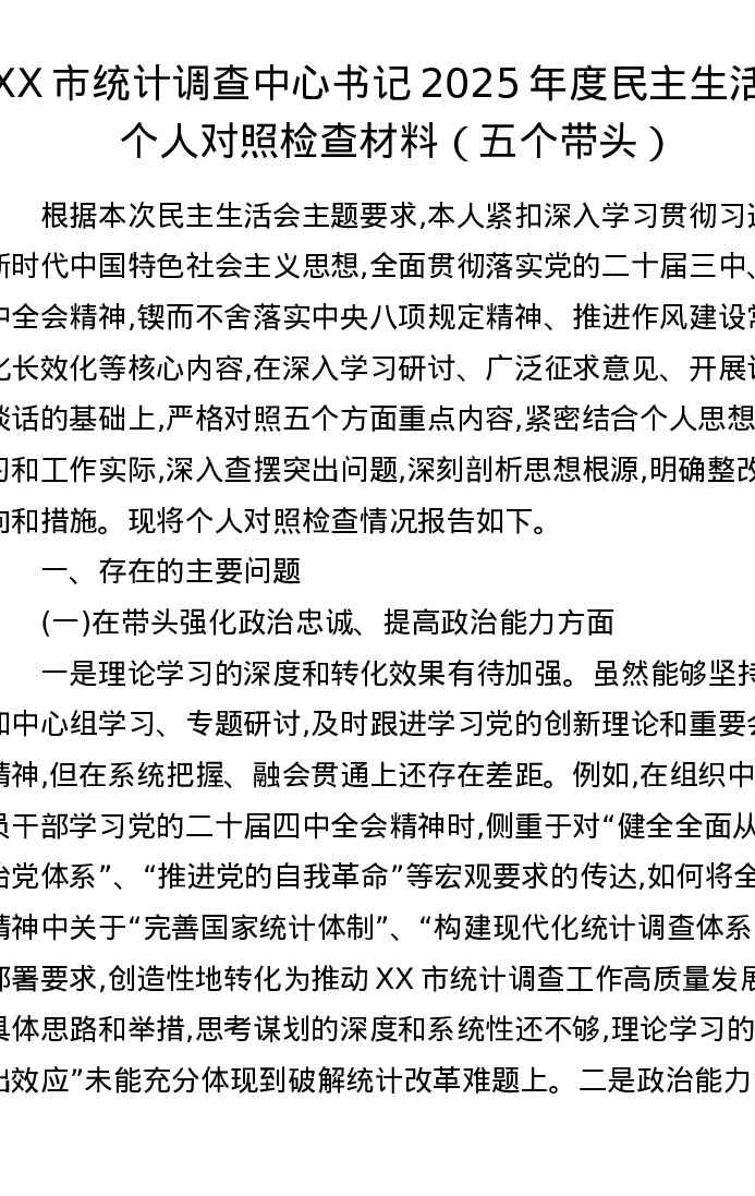 XX市统计调查中心书记2025年度xxxxx个人对照检查材料(五个带头)
