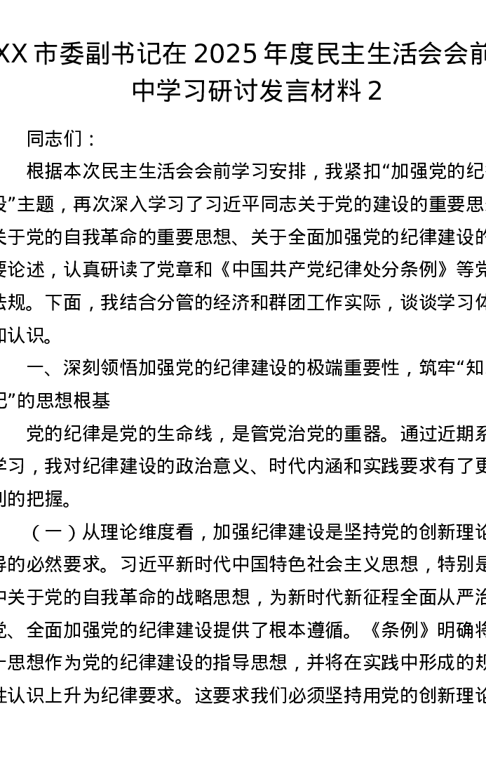 XX市委副书记在2025年度xxxxx会前集中学习研讨发言材料2