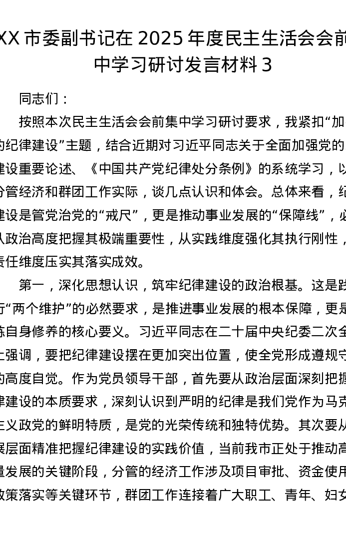 XX市委副书记在2025年度xxxxx会前集中学习研讨发言材料3