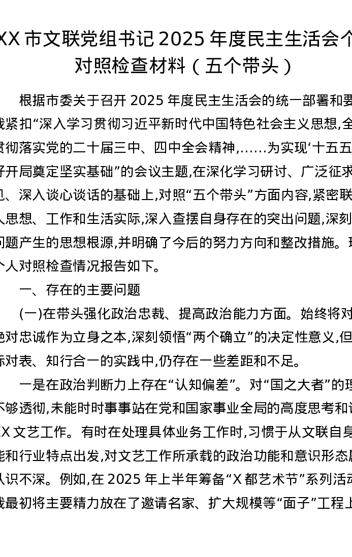 XX市文联党组书记2025年度xxxxx个人对照检查材料(五个带头)