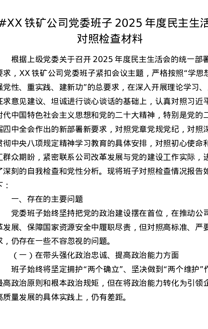 XX铁矿公司党委班子2025年度xxxxx对照检查材料