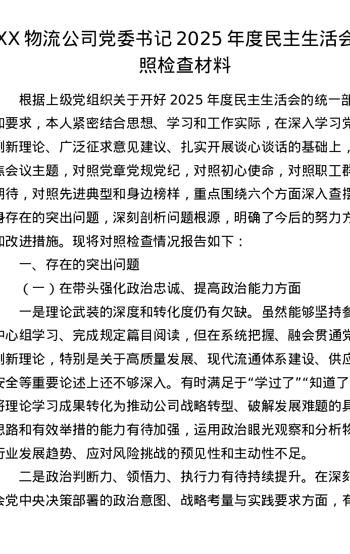 XX物流公司党委书记2025年度xxxxx对照检查材料
