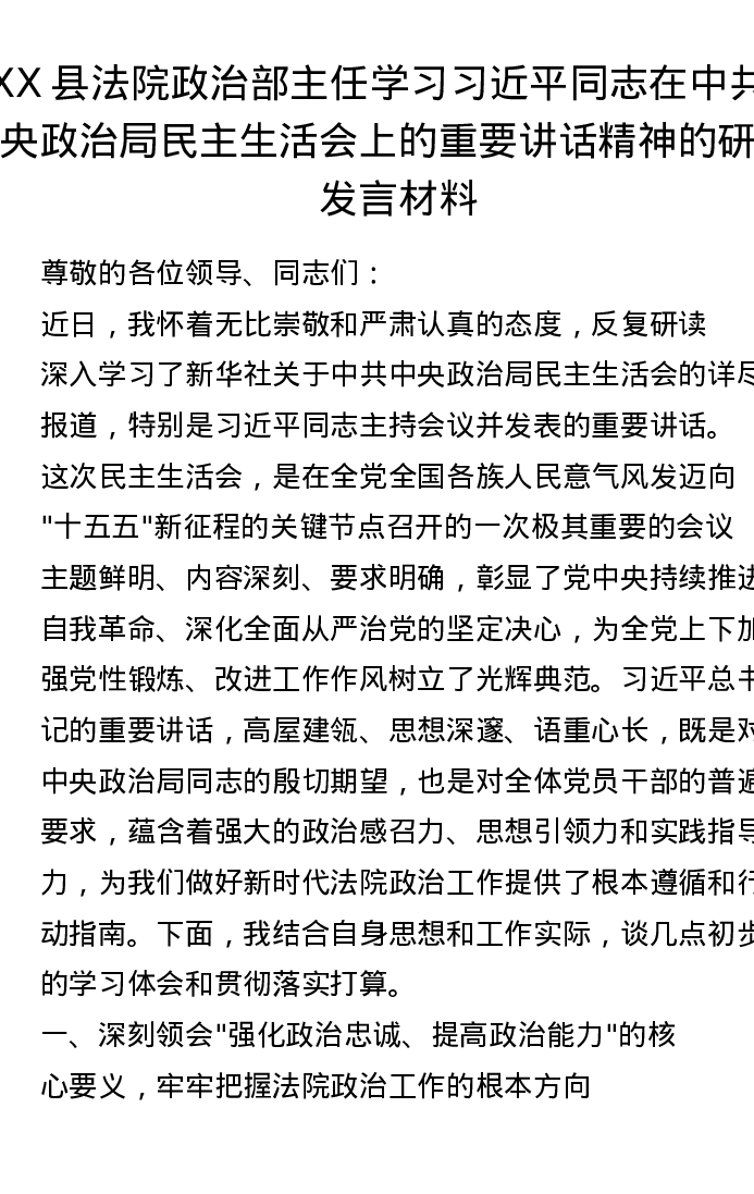 XX县法院政治部主任学习习近平总书记在中共中央政治局xxxxx上的重要讲话精神的研讨发言材料
