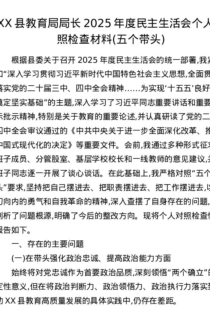 XX县教育局局长2025年度xxxxx个人对照检查材料(五个带头)