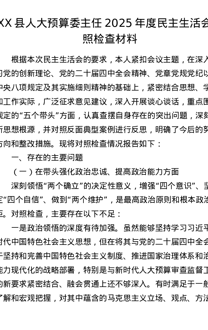 XX县人大预算委主任2025年度xxxxx对照检查材料