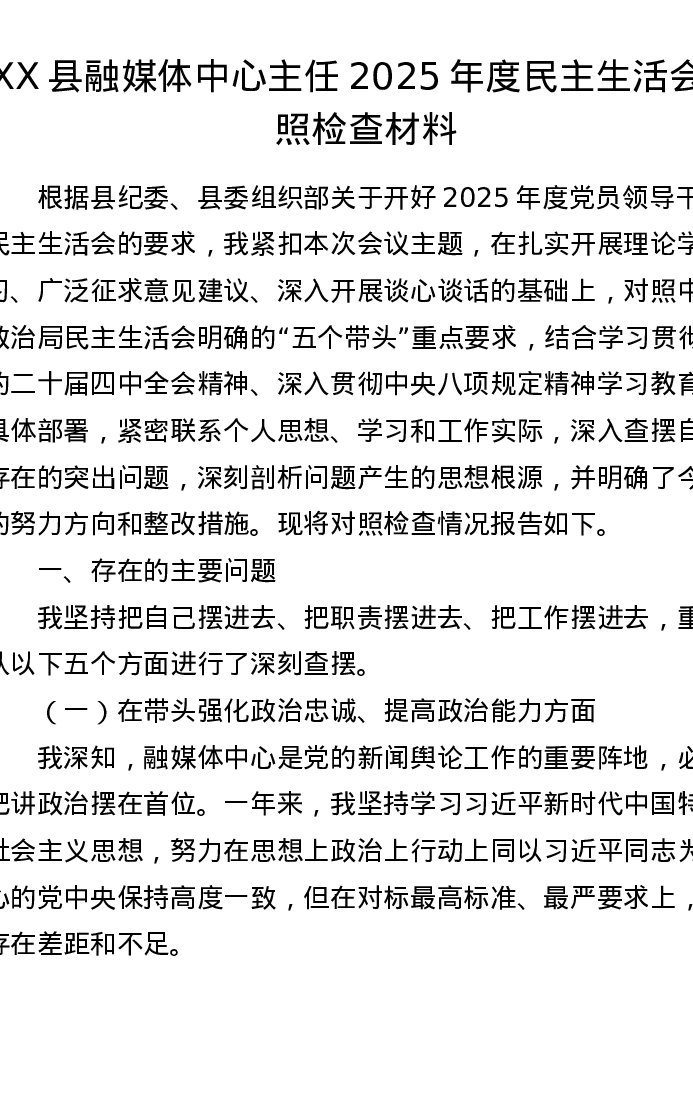 XX县融媒体中心主任2025年度xxxxx对照检查材料