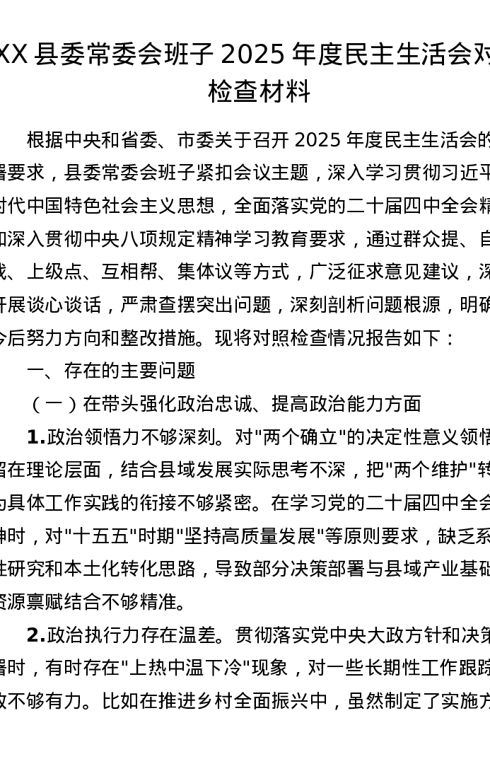 XX县委常委会班子2025年度xxxxx对照检查材料