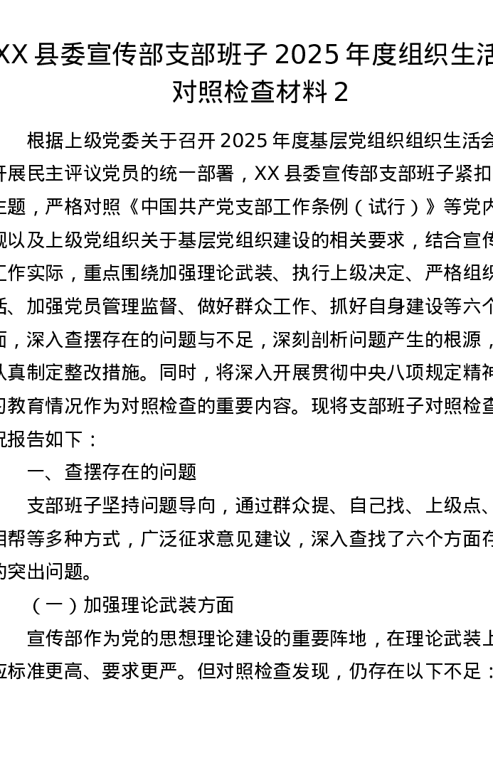 XX县委宣传部支部班子2025年度组织xxx对照检查材料2