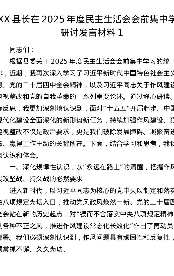 XX县长在2025年度xxxxx会前集中学习研讨发言材料1