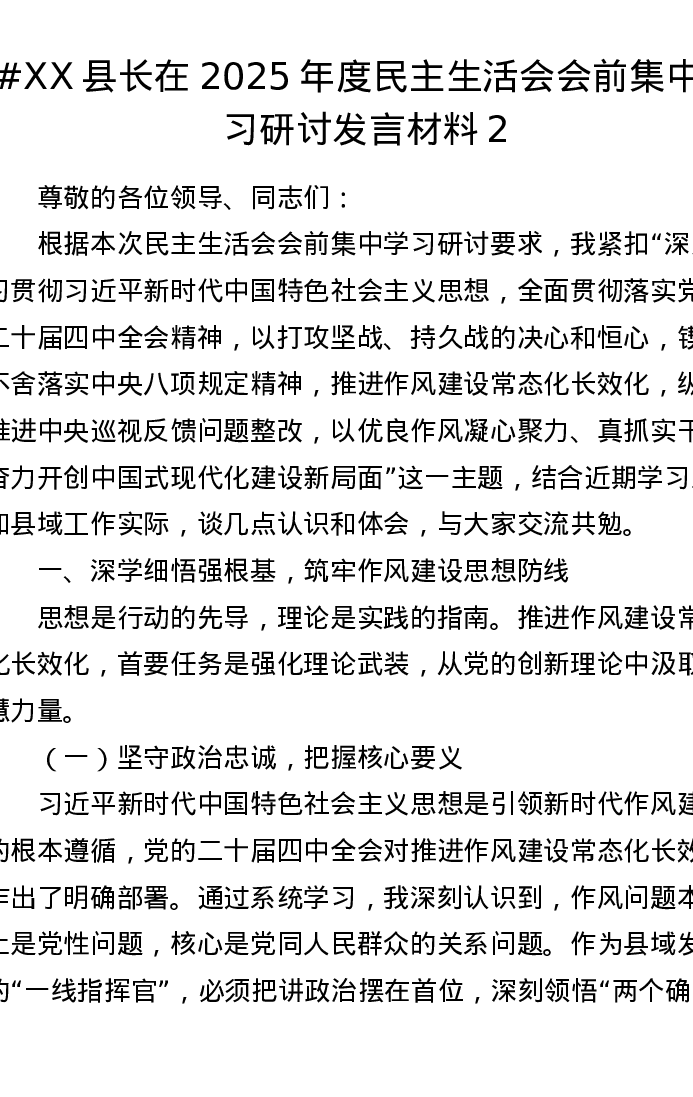 XX县长在2025年度xxxxx会前集中学习研讨发言材料2