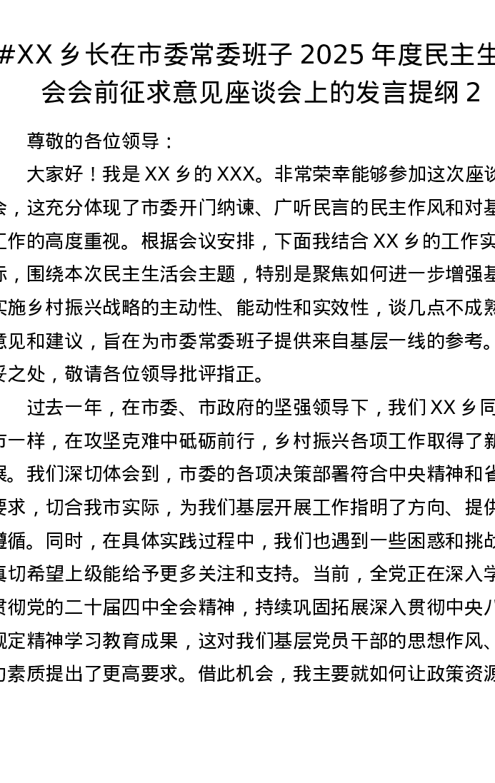 XX乡长在市委常委班子2025年度xxxxx会前征求意见座谈会上的发言提纲2