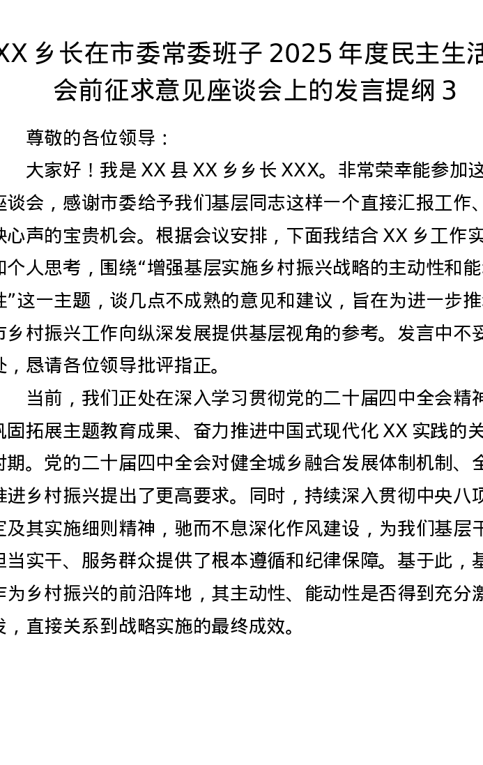XX乡长在市委常委班子2025年度xxxxx会前征求意见座谈会上的发言提纲3