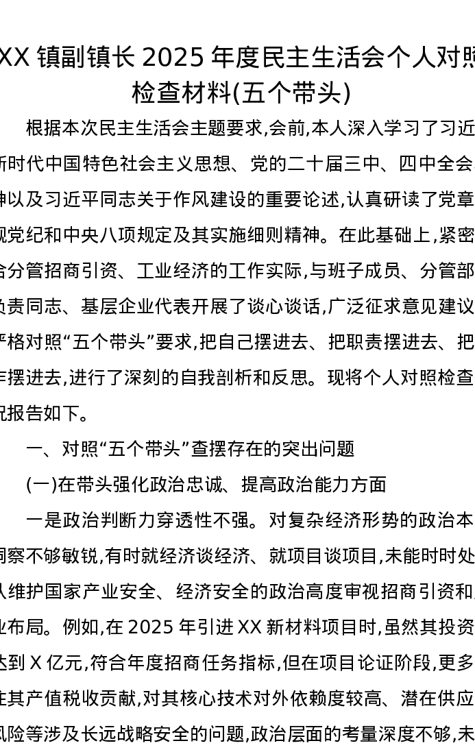XX镇副镇长2025年度xxxxx个人对照检查材料(五个带头)