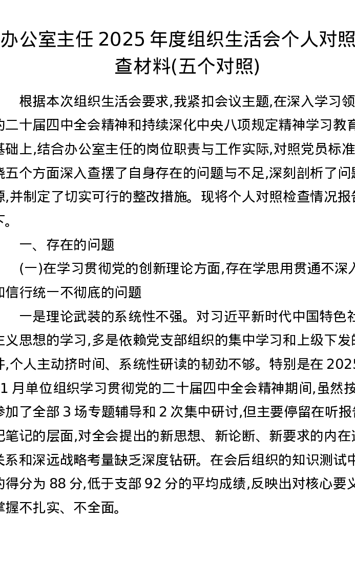办公室主任2025年度组织xxx个人对照检查材料(五个对照)
