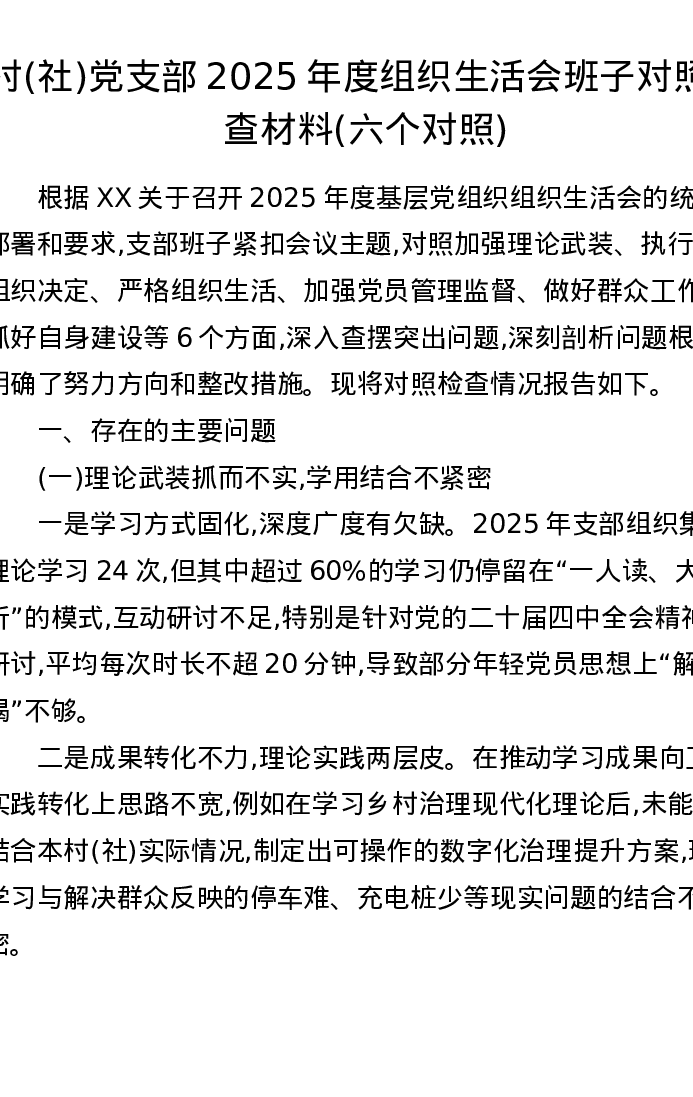 村(社)党支部2025年度组织xxx班子对照检查材料(六个对照)