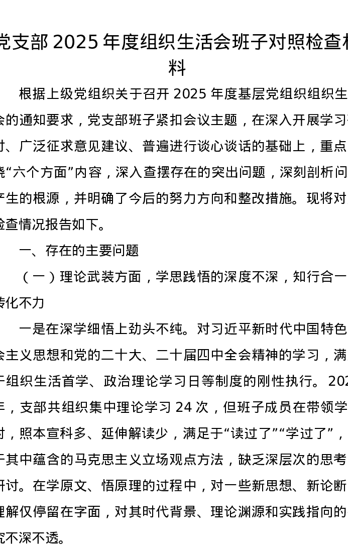 党支部2025年度组织xxx班子对照检查材料