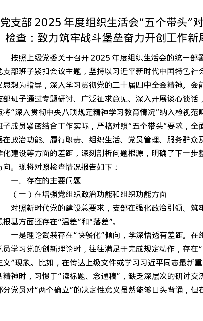 党支部2025年度组织xxx五个对照对照检查:致力筑牢战斗堡垒 奋力开创工作新局