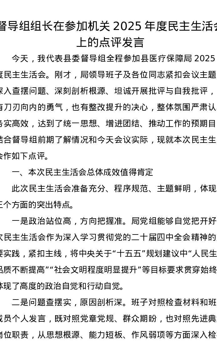 督导组组长在参加机关2025年度xxxxx上的点评发言