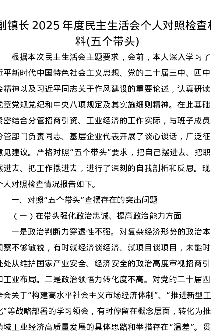 副镇长2025年度xxxxx个人对照检查材料(五个带头)