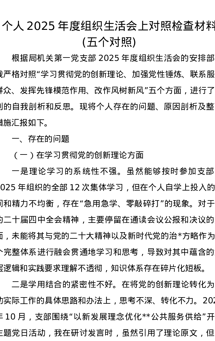 个人2025年度组织xxx上对照检查材料(五个对照)