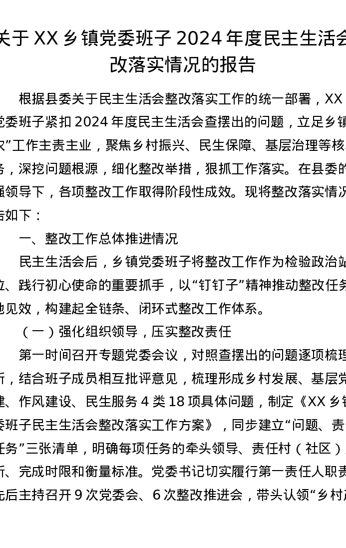 关于XX乡镇党委班子2024年度xxxxx整改落实情况的报告