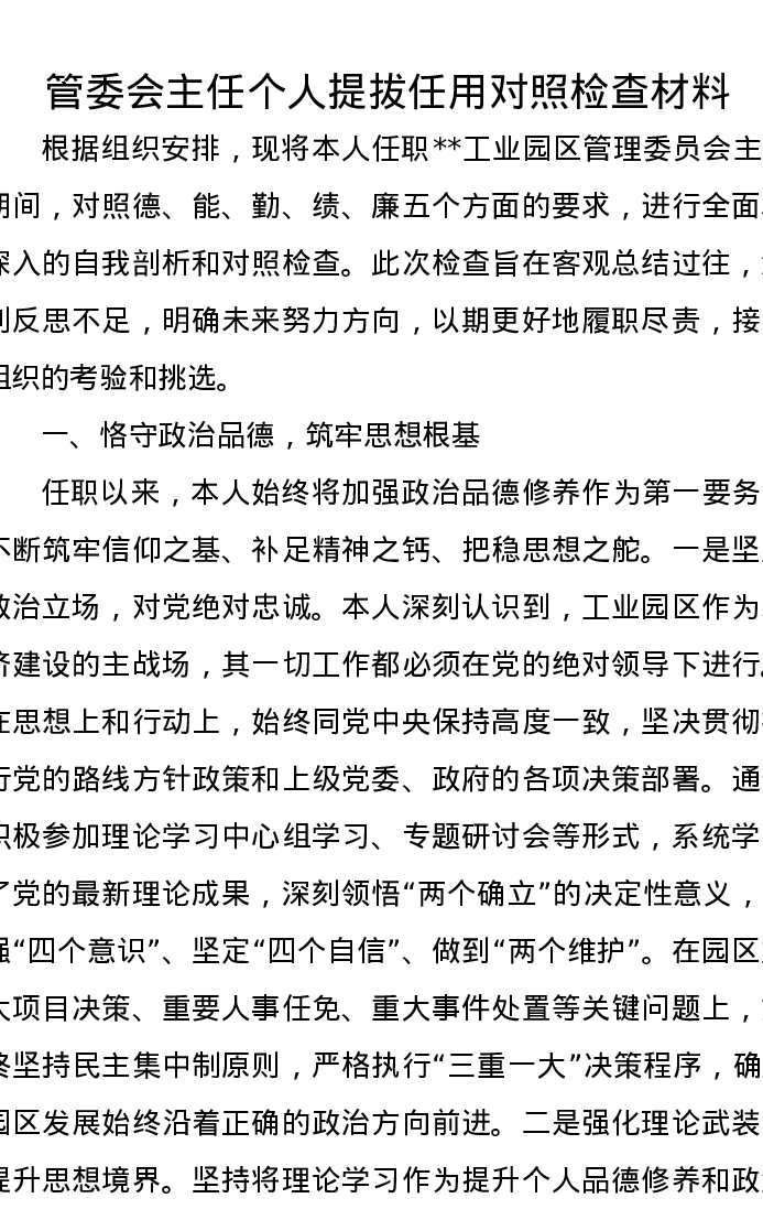 管委会主任个人提拔任用对照检查材料