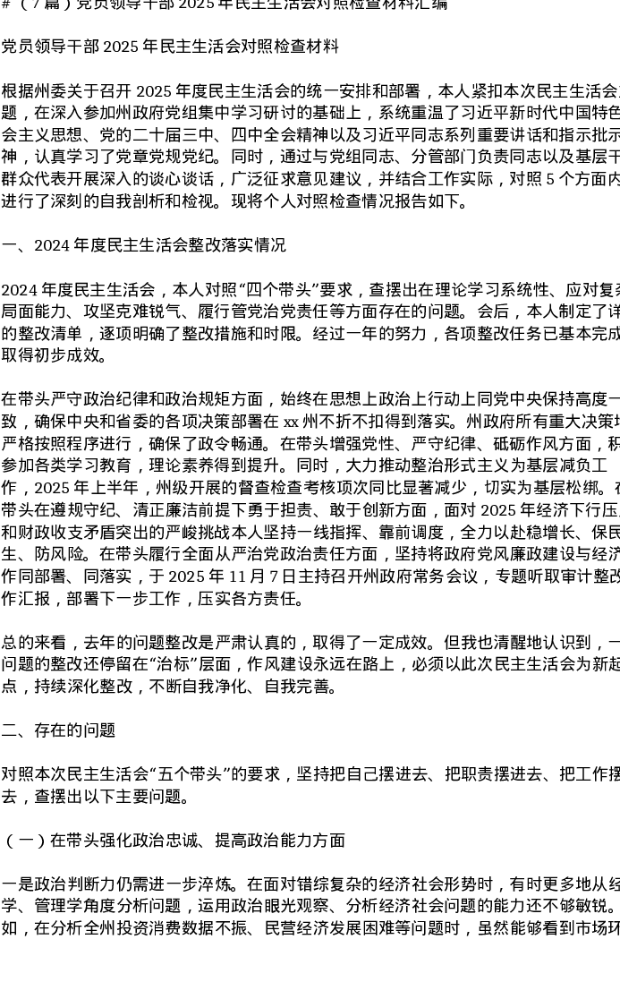 汇编:党员领导干部2025年xxxxx对照检查材料7篇