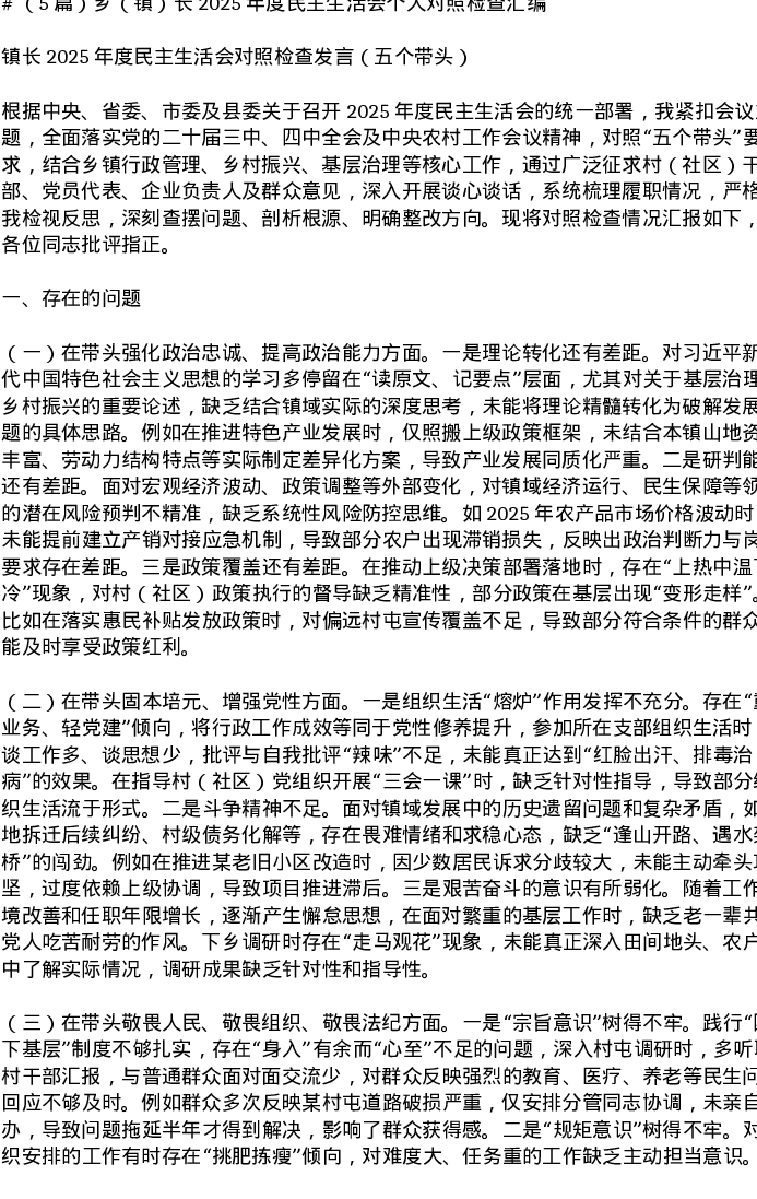汇编:乡(镇)长2025年度xxxxx个人对照检查5篇