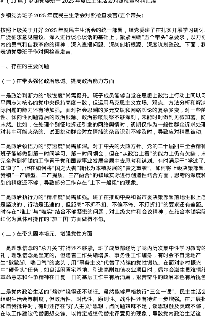 汇编:乡镇党委班子2025年度xxxxx对照检查材料13篇