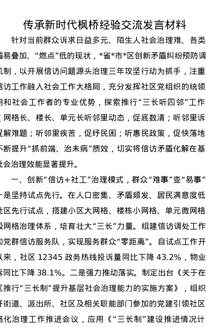 传承新时代枫桥经验交流发言材料