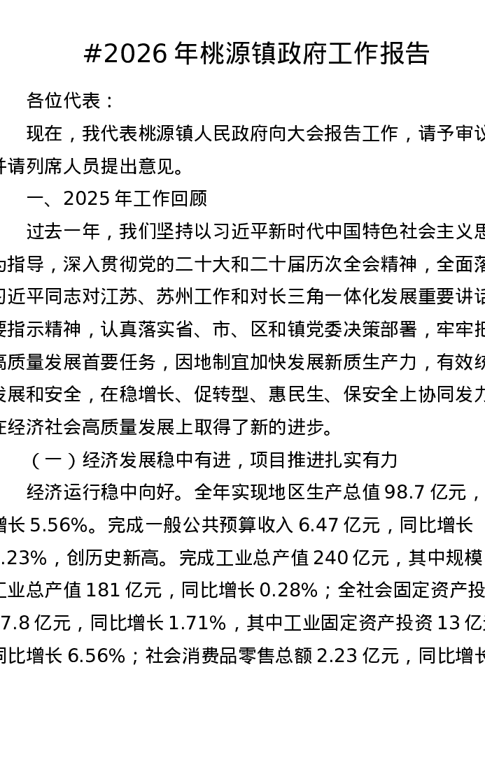 2026年桃源镇政府工作报告