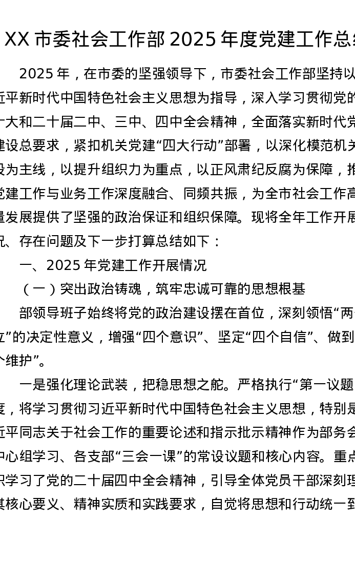 XX市委社会工作部2025年度党建工作总结