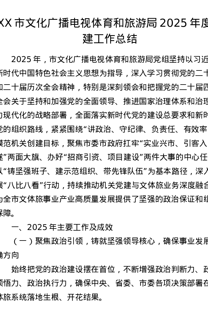 XX市文化广播电视体育和旅游局2025年度党建工作总结