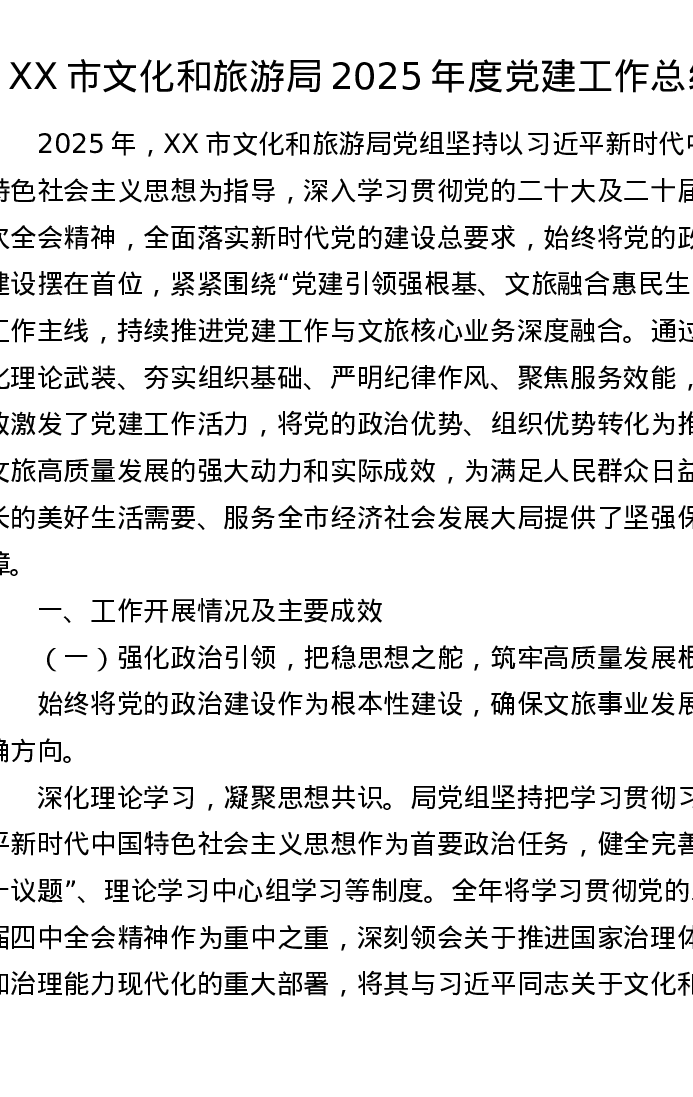 XX市文化和旅游局2025年度党建工作总结