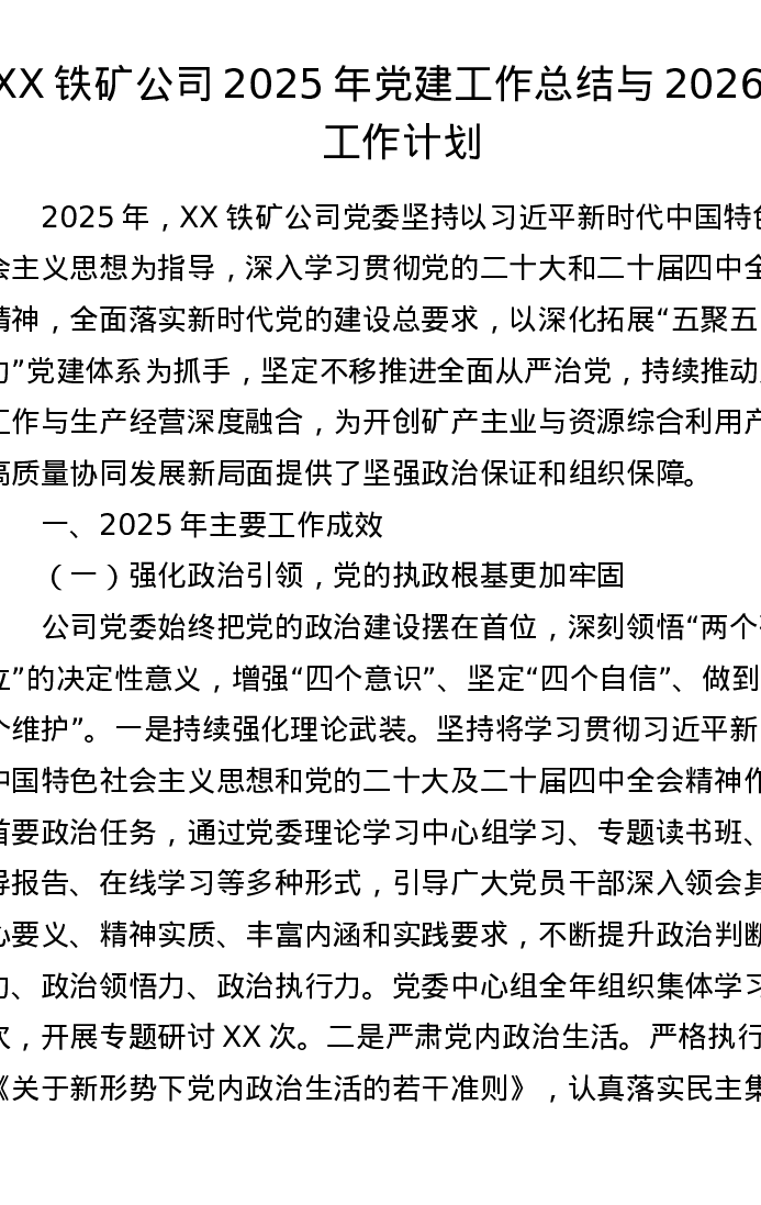 XX铁矿公司2025年党建工作总结与2026年工作计划