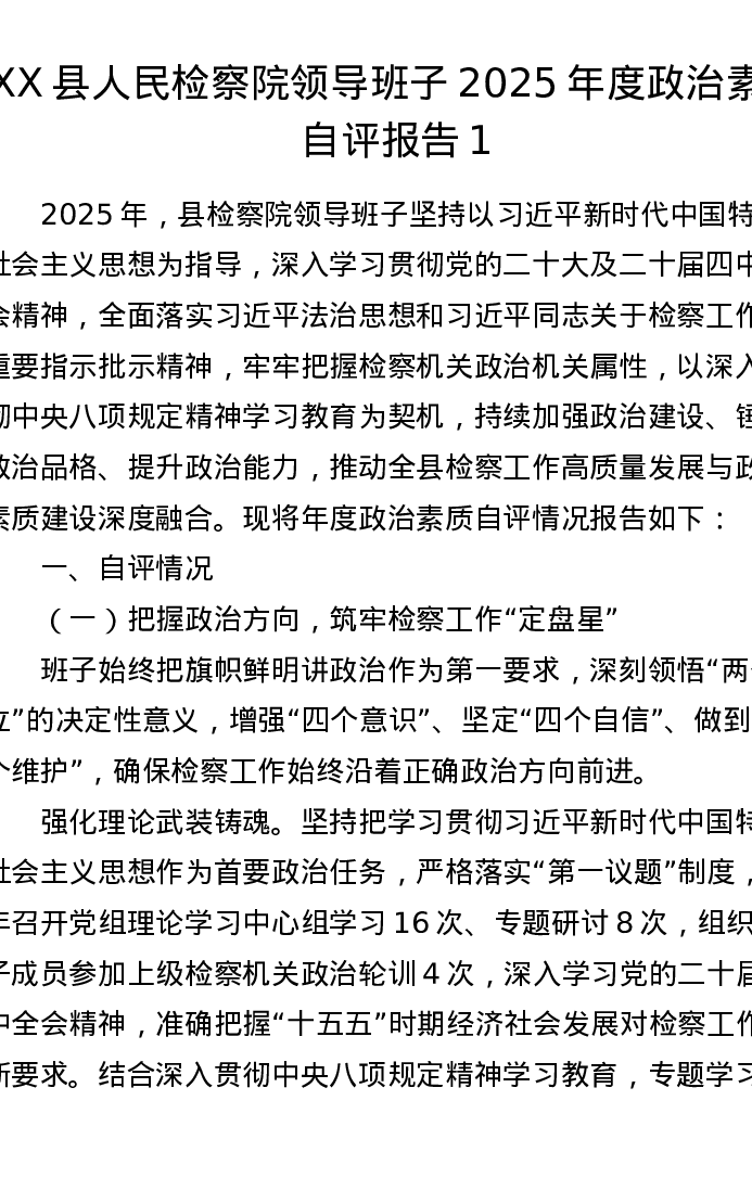 XX县人民检察院领导班子2025年度政治素质自评报告1