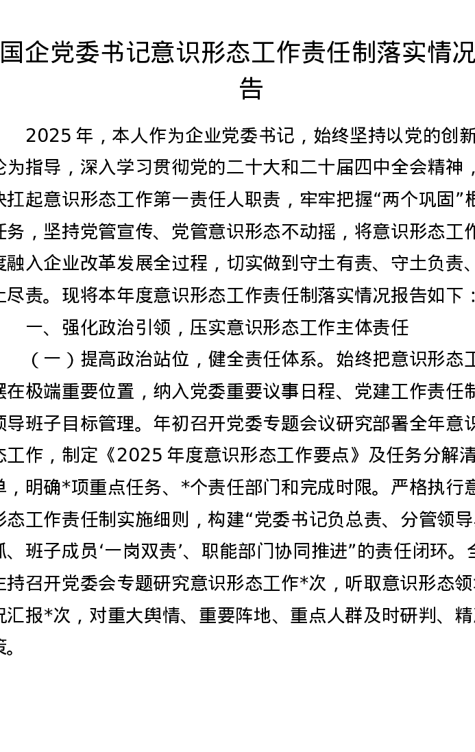 国企党委书记意识形态工作责任制落实情况报告