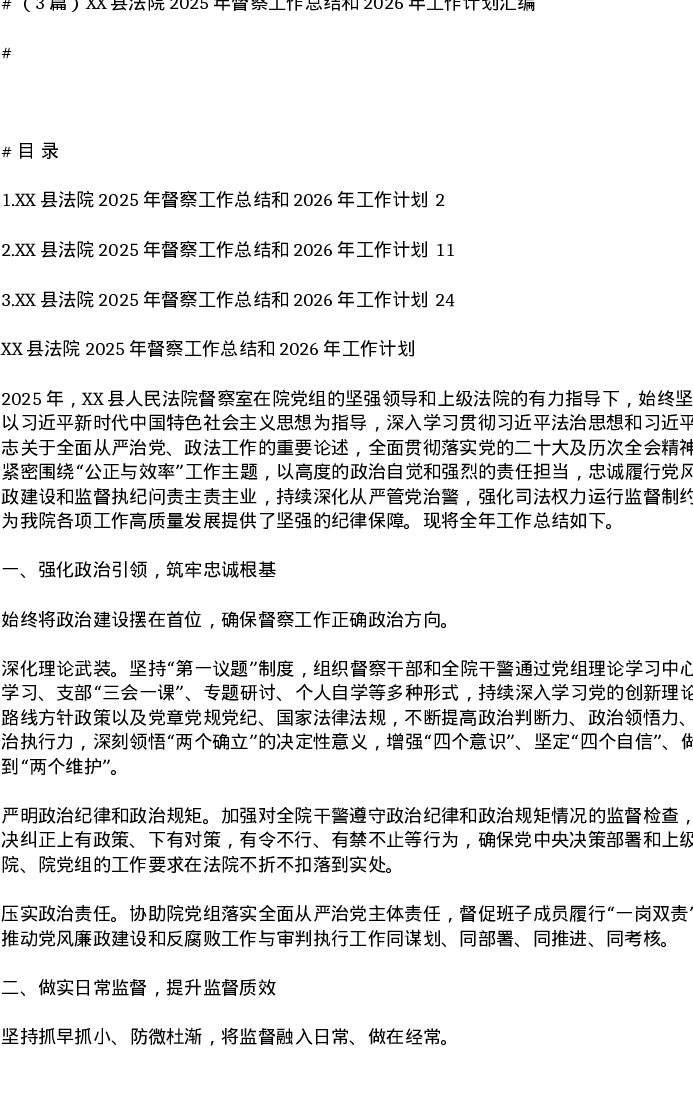 汇编:XX县法院2025年督察工作总结和2026年工作计划3篇