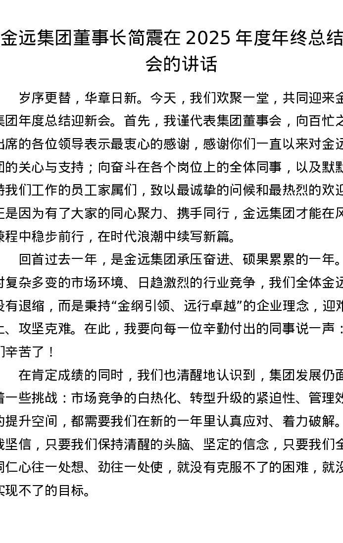 金远集团董事长简震在2025年度年终总结大会的讲话
