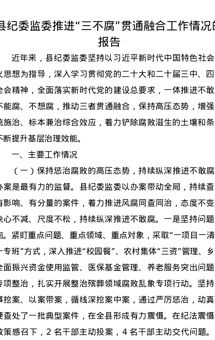 县纪委监委推进三不腐贯通融合工作情况的报告