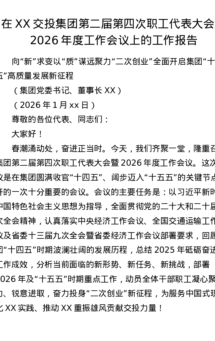 在XX交投集团第二届第四次职工代表大会暨2026年度工作会议上的工作报告