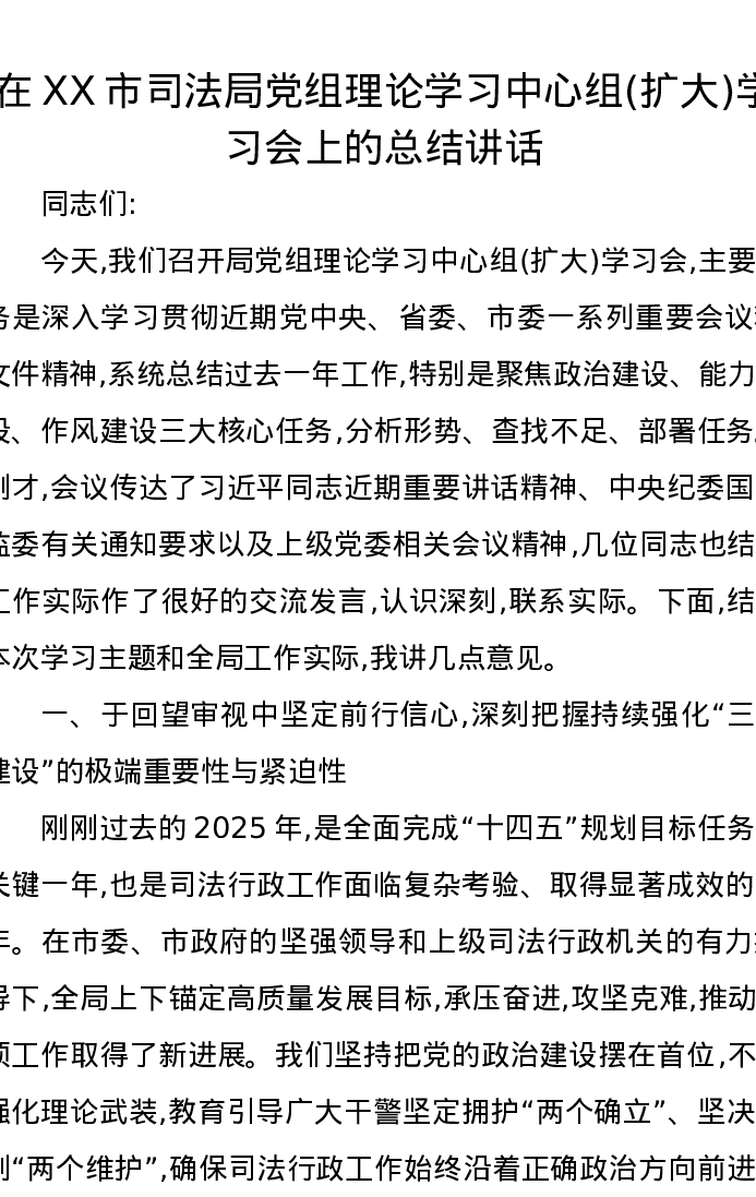 在XX市司法局党组理论学习中心组(扩大)学习会上的总结讲话