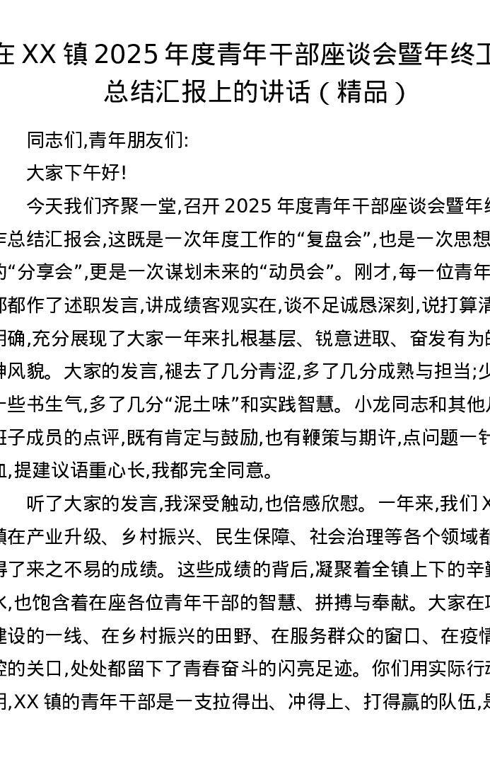 在XX镇2025年度青年干部座谈会暨年终工作总结汇报上的讲话