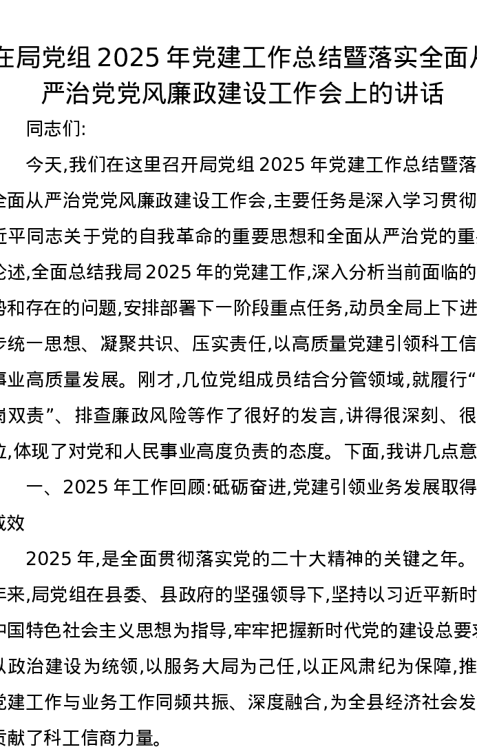 在局党组2025年党建工作总结暨落实全面从严治党党风廉政建设工作会上的讲话